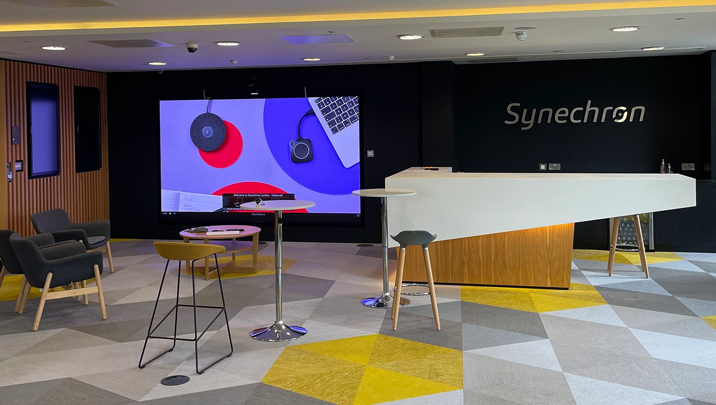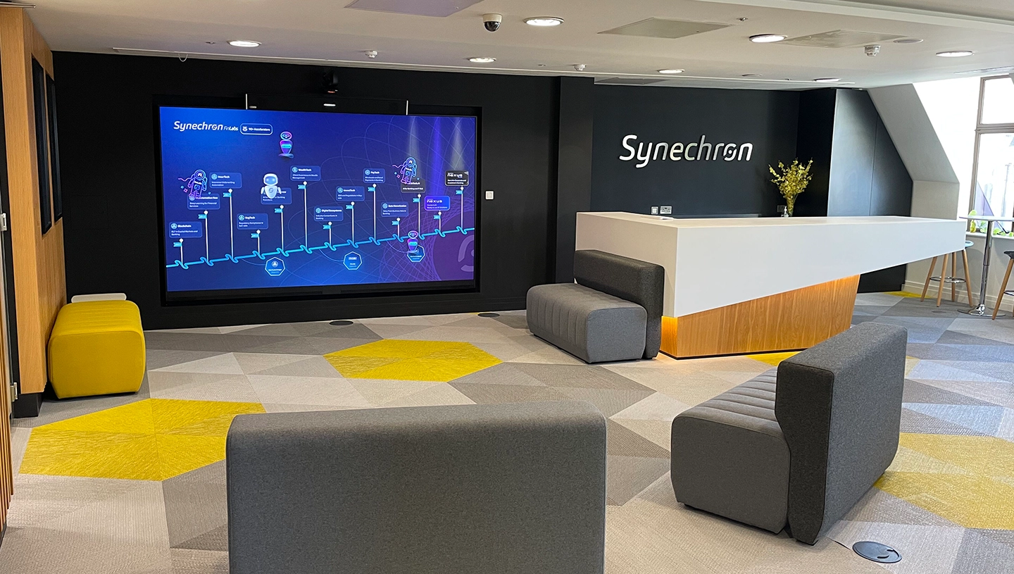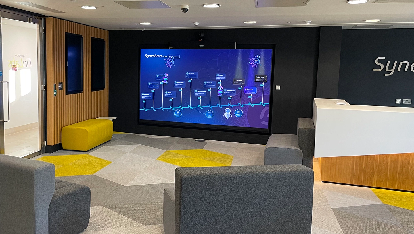 Synechron a leading global digital transformation consultancy specialising in financial services and artificial intelligence, engaged Mantra Interiors to deliver a complete installation of a large format videowall, including all associated electrical, data and construction works. The space was fully redecorated and enhanced with high-level loose furnishings and bespoke meeting tables creating a modern and functional environment.